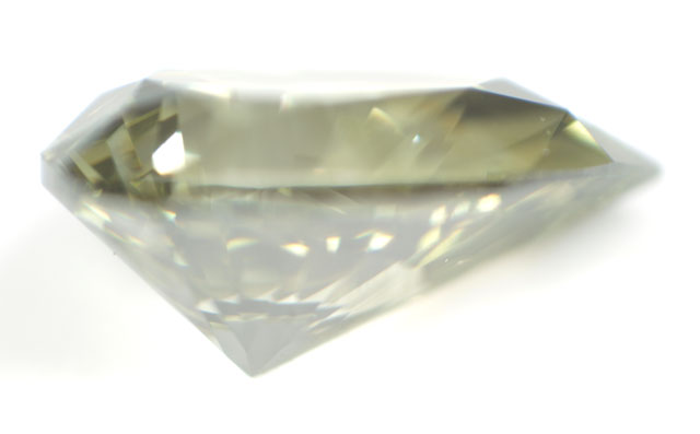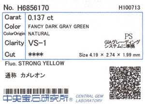 ●ナチュラルのカメレオンダイヤモンドです。ナチュラルとは、ダイヤモンドそのものもカラーも、全て天然で本物であると鑑定されたダイヤモンドのことを言います。●カメレオンダイヤモンドとは、温度や光の明暗によってカラーが変わるダイヤモンドのことを言います。 一般的には、 (1)金属製のスプーンなどの上においてライターの炎で緩やかに加熱、 (2)冷蔵庫などの冷暗所に一晩置いておく、 の2方法によって色の変化を確認できます。●実際に金属製のスプーンの上に置いて、ライターで約1分ほど徐々に熱しましたところ、グレイとグリーンの色が抜けて、茶色がかった黄色になりました。●そしてカメレオンダイヤの特徴の一つとして、蛍光性の面白さがあります。●蛍光性とは、紫外線やX線など波長の短い光線を当てると放射ルミネッセンスの結果、第一次光とは違った色の第二次光を発する性質を言います。一般的には、ブラック・ライトなどを当てることで簡単にダイヤなどの蛍光性を楽しむことが出来ます。●このダイヤの蛍光は「Strong Yellow」。ダイヤモンドは通常、蛍光性が無い(None)、弱い(Faint)、が多く、蛍光性として多い色はブルーとなっています。このダイヤのように元の色がグリーン系で、蛍光性がイエローというキレイなものは持っていても良いダイヤだと思います。●またこのダイヤは『燐光性』も持っているかもしれません。ブラックライトに当て、ブラックライトを消した後も数秒程度ですが、ホンワカ光っていました。●そして、何よりダイヤモンドそのものとして綺麗です。「Fancy Dark」という評価ですが、十分にテリがあってよく輝いています。●カラオケボックスなどブラックライトのある場所ですと、通常光とは違う色を楽しむことが出来ると思います。●クラリティは「VS-1」です。ルーペで見ると表面に欠けが確認できますが肉眼では全く問題ナシです。内包物などは、ルーペ・肉眼でも全く問題ナシです。●そして、「ポリッシュ(研磨状態)」は「ベリーグッド」、「シンメトリー(対称性)」は「グッド」の評価。ソーティング袋には記載されておりませんが、やはりカラーダイヤで「ポリッシュ」と「シンメトリー」で「Very Good」や「Good」は高評価と考えて良いと思います。●そのおかげか、テリがしっかりあり、とても良く輝きます。