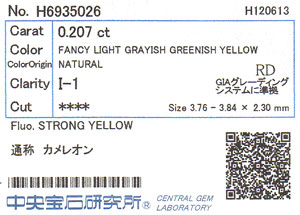 | 製品名 | 天然カメレオンダイヤモンド ルース(裸石) 0.207ct (天然イエローダイヤモンド) 【 中央宝石研究所ソーティング袋付 】 |