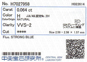 | 製品名 | 【 90面体カット 】 天然ダイヤモンド ルース(裸石) 0.064ct, Hカラー, VVS-2 【中央宝石研究所ソーティング袋付】 |