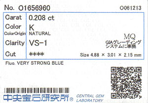| 製品名 | 天然ダイヤモンド ルース(裸石) 0.208ct, Kカラー, VS-1, マーキース 【 中央宝石研究所ソーティング袋付 】 |