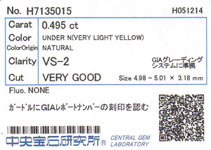 | Carat (キャラット) | 0.49ct (GIA), 0.495ct (CGL:中央宝石研究所) |