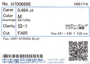 製品名【 蛍光性:ベリー・ストロング・ブルー 】 天然ダイヤモンド ルース 0.484ct 【 Mカラー 】【中央宝石研究所】