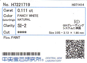 | 製品名 | 天然ホワイトダイヤモンド ルース(裸石) 0.111ct, Fancy White (ファンシーホワイト),SI-2, 【 中央宝石研究所ソーティング袋付 】 |