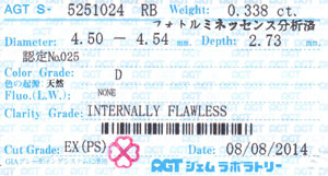 | カラット | 0.338ct(AGT), 0.339ct(CGL) | |||||||||||||||||||||||||||||||||||