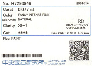 | 製品名 | 天然ピンクダイヤモンド ルース(裸石) 0.077ct, ファンシーインテンスピンク, SI-1, ラウンドブリリアントカット 【 中央宝石研究所 】 |