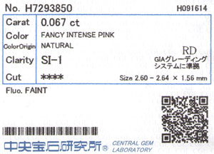 | 製品名 | 天然ピンクダイヤモンド ルース(裸石) 0.067ct, ファンシーインテンスピンク, SI-1, ラウンドブリリアントカット 【 中央宝石研究所 】 |