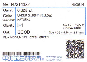 ●そして、蛍光性が「ミディアム・イエローイッシュ・グリーン」。紫外線に当たるとダイヤモンドは蛍光色を発するものもあります。