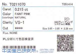 | 製品名 | 天然ピンクダイヤモンド ルース(裸石) 0.215ct, VS-1,フェイントピンク 【 中央宝石研究所ソーティング袋付 】 |