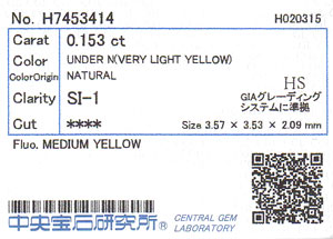 | 製品名 | 【 Under N (Very Light Yellow) カラー 】 天然ダイヤモンド ルース(裸石) 0.153ct, SI-1,ハートシェイプ 【蛍光性はイエロー系】 |