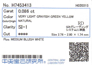 製品名天然イエローダイヤモンド ルース (裸石) 0.086ct,SI-1 【蛍光性はミディアム・ブルーイッシュ・ホワイト】【中央宝石研究所ソーティング袋付】