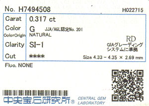 | 製品名 | 【 57面体カット 】【 ダイヤの中に星が見えます 】 天然ダイヤモンド ルース(裸石) 0.317ct, Gカラー, SI-1 【 中央宝石研究所ソーティング袋付 】 |