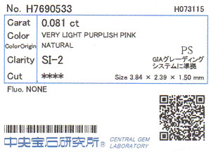 | 製品名 | 天然ピンクダイヤモンド ルース(裸石) 0.081ct ベリー・ライト・パープリッシュ・ピンク, SI-2 【中央宝石研究所ソーティング袋付】 |