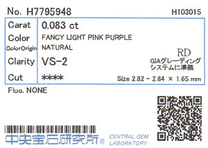 製品名天然パープルダイヤモンド ルース(裸石) 0.083ct, Fancy Light Pink Purple , VS-2 【 中央宝石研究所ソーティング袋付 】