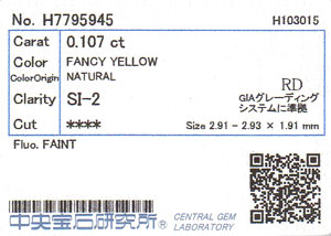 | 製品名 | 天然イエローダイヤモンド ルース(裸石) 0.107ct, ファンシー・イエロー, SI-2 【 中央宝石研究所ソーティング袋付 】 |