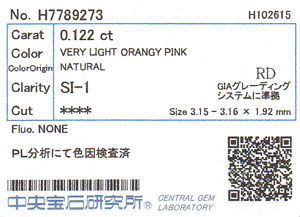 ●ナチュラルのカラーダイヤモンドです。ナチュラルとは、ダイヤそのものはもちろん、色の起源も全て天然の本物のカラーダイヤモンドのことを言います。●淡いピンクグレープフルーツのような色調です。●また、フォトルミネッセンス分析により、『 タイプ2a型 』という、レア中のレアなダイヤモンドと判明しました。●クラリティはSI-1。ルーペでは内包物等がありますが、肉眼ではまず問題無しです(目の良い方でしたら肉眼でも見えるかもしれません)。●そして、「ポリッシュ(研磨状態)」は「グッド」、「シンメトリー(対称性)」も「グッド」の評価。ソーティング袋には記載されておりませんが、やはりカラーダイヤで「ポリッシュ」と「シンメトリー」で「Good」は高評価と考えて良いと思います。●リングやペンダントや片耳用ピアスや片耳用イヤリング、またこだわりのエンゲージリング(婚約指輪)への加工も承ります(別料金)。